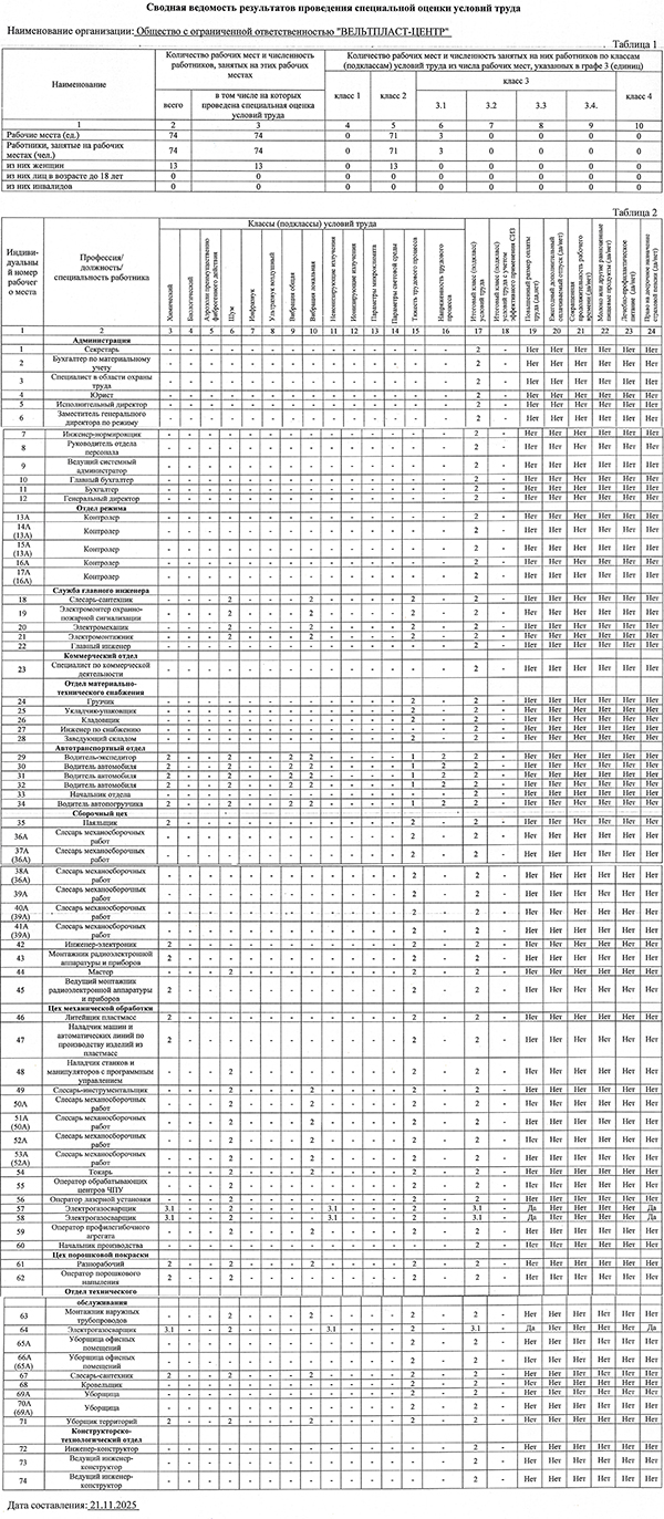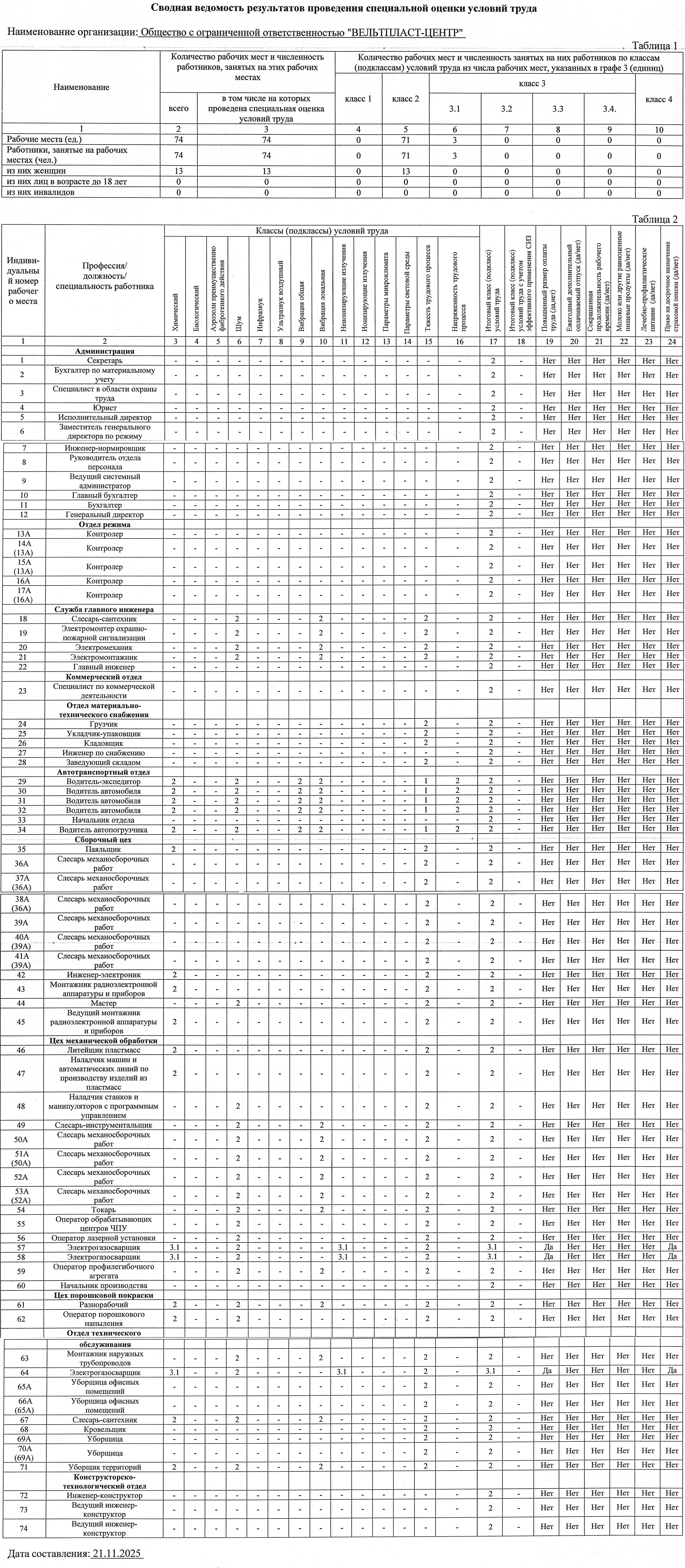Сводная ведомость результатов оценки условий труда.