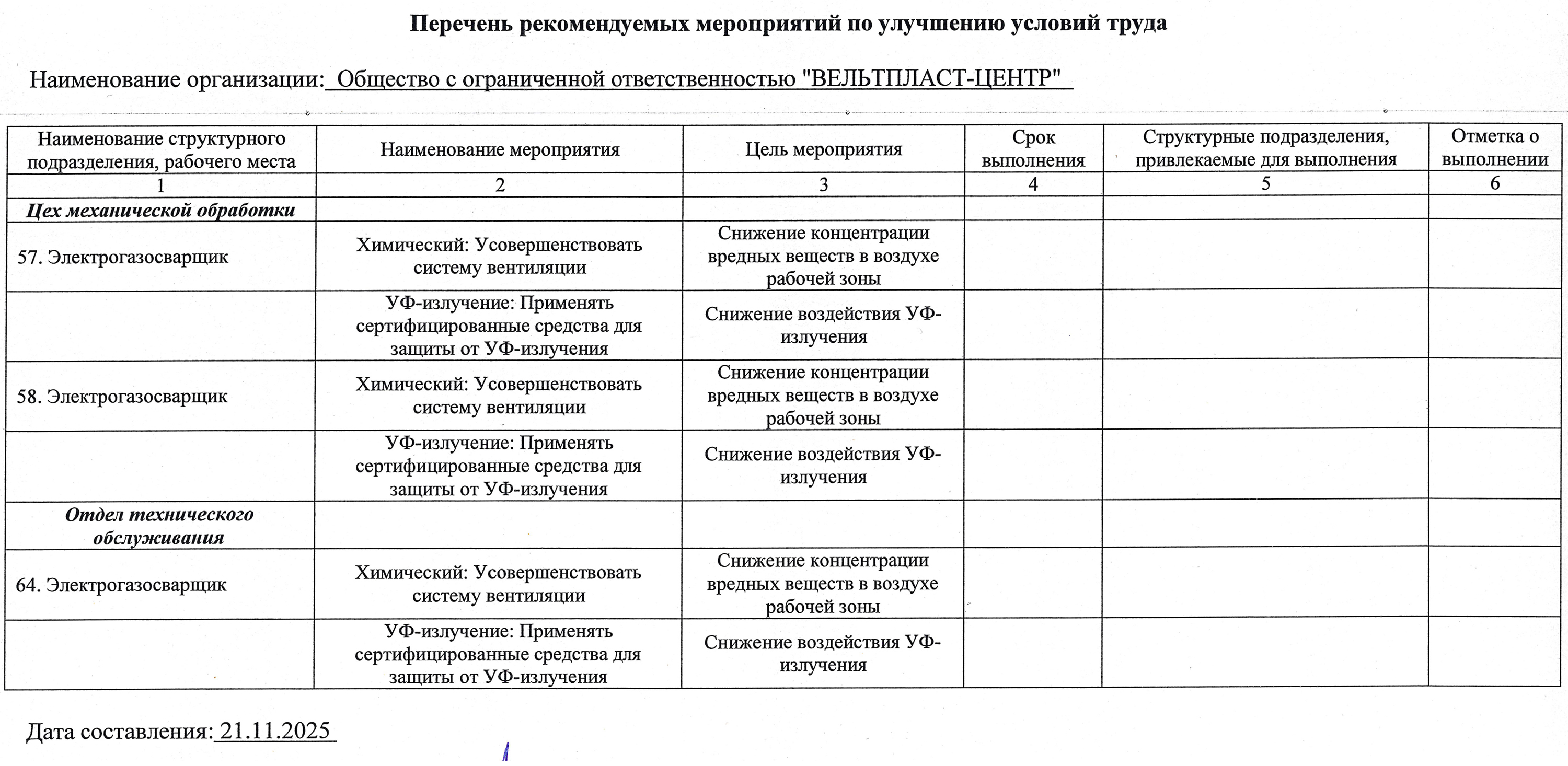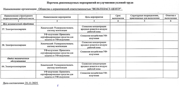 Перечень рекомендуемых мероприятий по улучшению условий труда.